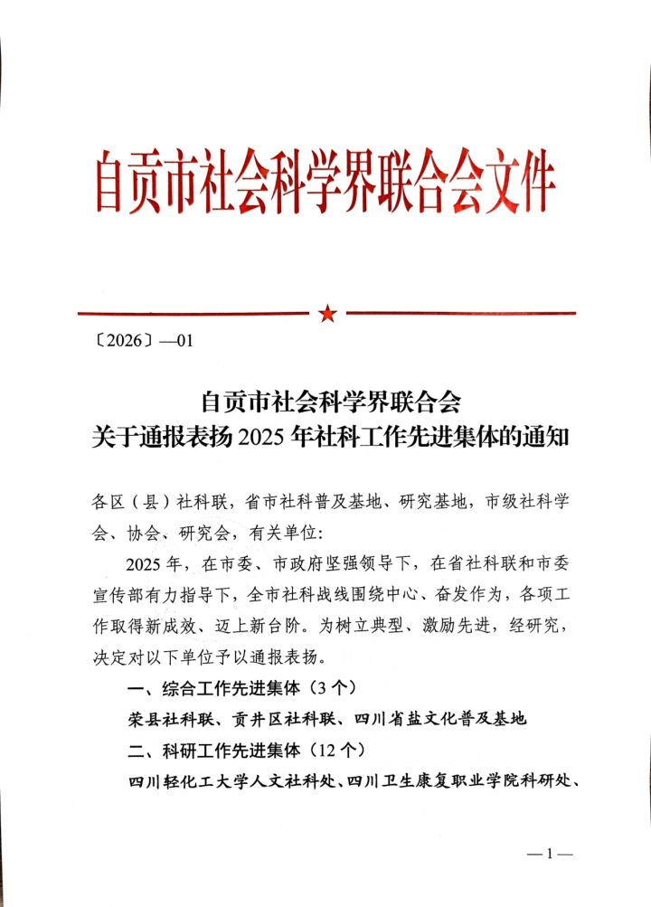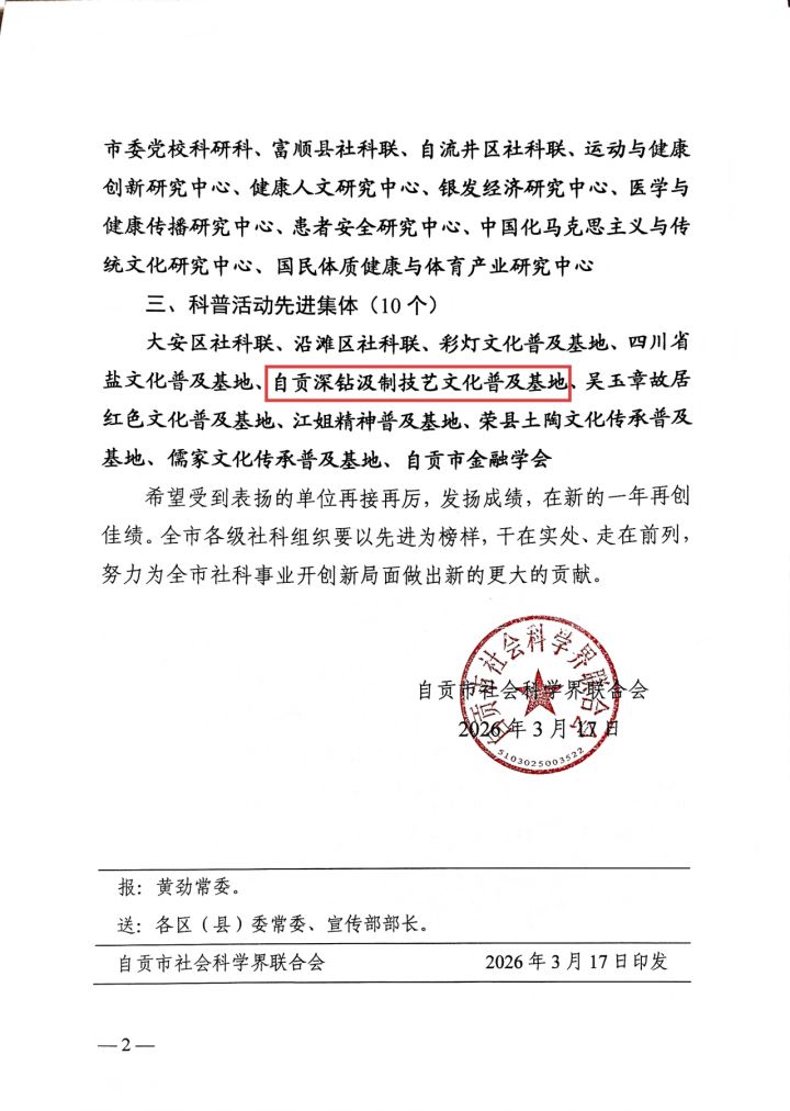 近日,自贡市社会科学界联合会发布《关于通报表扬2025年社科工作先进集体的通知》,自贡深钻汲制技艺文化普及基地成功入选“科普活动先进集体”。